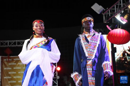 11月8日,在贝宁经济首都科托努举行的“中国贝宁服装秀”活动中,阿波美卡拉维大学孔子学院学生展示中国民族服饰。新华社发(塞拉芬摄)