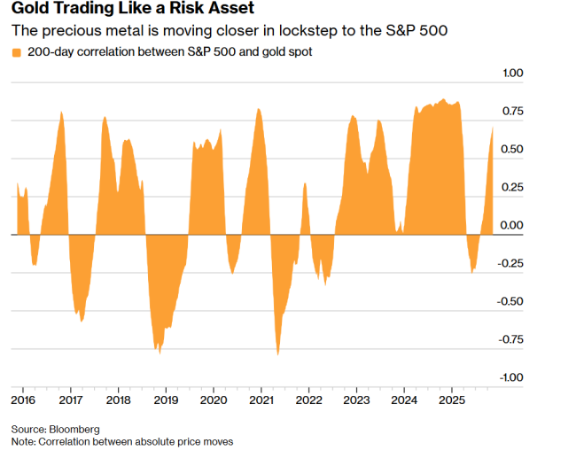 数十年来,黄金一直与股市呈反向走势,但在美元贬值担忧及各国央行对这一贵金属的旺盛需求推动下,黄金与股市的相关性已转为正向。22V研究公司衍生品策略主管杰弗里·雅各布森在电话采访中表示,一段时间以来,黄金交易堪比迷因股。