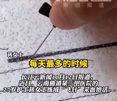 近日,云南曲靖某三甲医院的27岁护士蒋女士练成“飞针”采血绝活。蒋女士告诉长江云新闻记者,这项技术看似简单,却是她每天在泡沫板上练习6000多次、总共扎出10万多个针孔才练成的。她表示,为了让患者少一点疼痛,从最初在泡沫板上练针,到与同事互相练习,再到在模拟的假臂上反复演练,反复打磨每一个进针角度、速度和距离。“不少患者表示一点都不疼,我觉得就值了。”