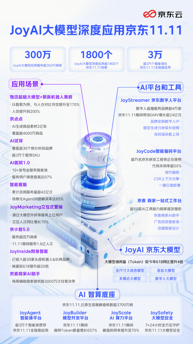 2025年京东11.11订单峰值、物流时效、商家营收持续攀升。在这背后,一场由人工智能深度驱动的效率革新正在发生,以JoyAI为核心的全栈AI技术产品,已渗透进京东供应链全链路。在京东11.11期间,JoyAI大模型应用服务超300万商家,深度应用在超1800个场景,有超3万个智能体在京东场景应用。从内部运营到商家经营,再到最终用户的消费体验,JoyAI大模型在全场景应用、平台化服务、AI智算底座三个层面实现系统性突破,重塑超级供应链,释放增长新动能。