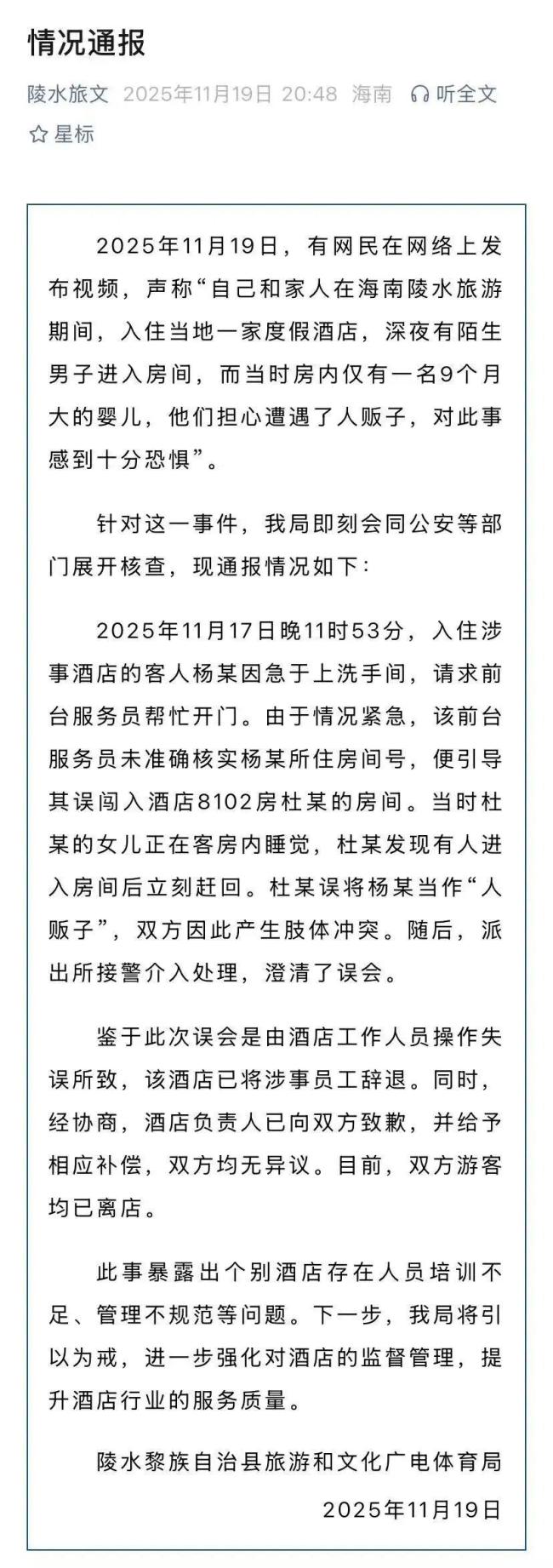 11月19日,海南陵水黎族自治县旅游和文化广电体育局通报了一起事件。有网民发布视频称,在海南陵水旅游期间,入住当地一家度假酒店时,深夜有陌生男子进入房间,当时房内仅有一名9个月大的婴儿,他们担心遭遇了人贩子,对此事感到十分恐惧。
