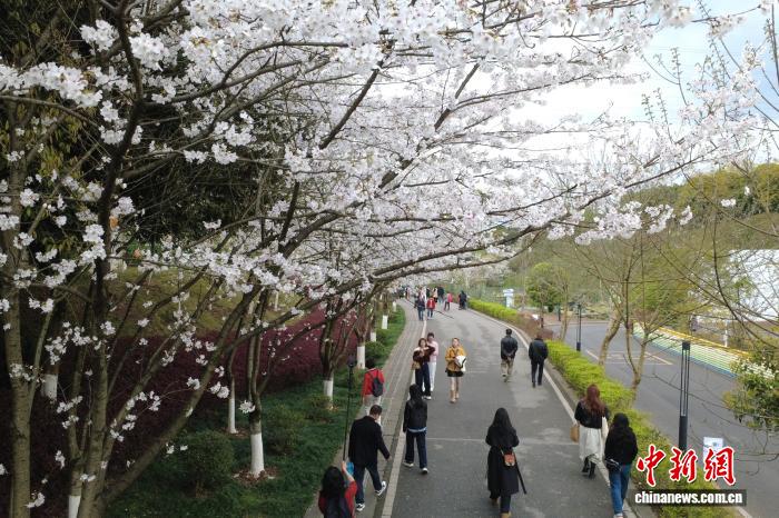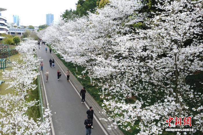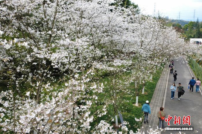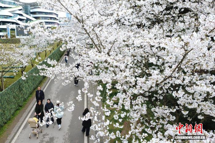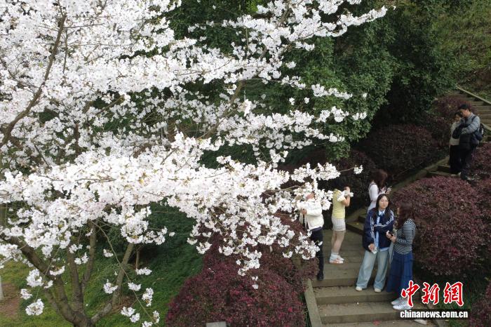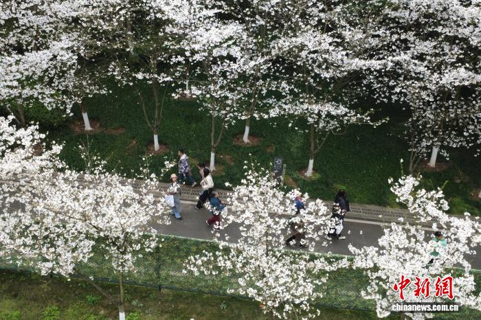 图为游客在重庆园博园赏花拍照。(无人机照片)中新社记者 肖江川 摄