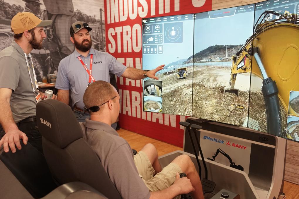 3月4日,在美国拉斯维加斯工程机械展上,参观者在三一重工展厅体验智能挖掘机器人系统。新华社发(曾慧摄)