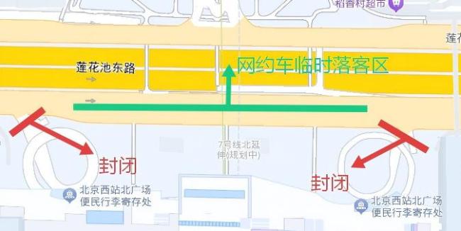 此外,在莲花池东路辅路西向东方向北广场前设置临时落客区域,实行即停即走。送站车辆需服从现场引导,快速下客、有序驶离。具体路线为:莲花池东路辅路西向东行驶,驶入临时落客区,快速下客后乘客步行进站,车辆立即向东驶离(无折返路线)。