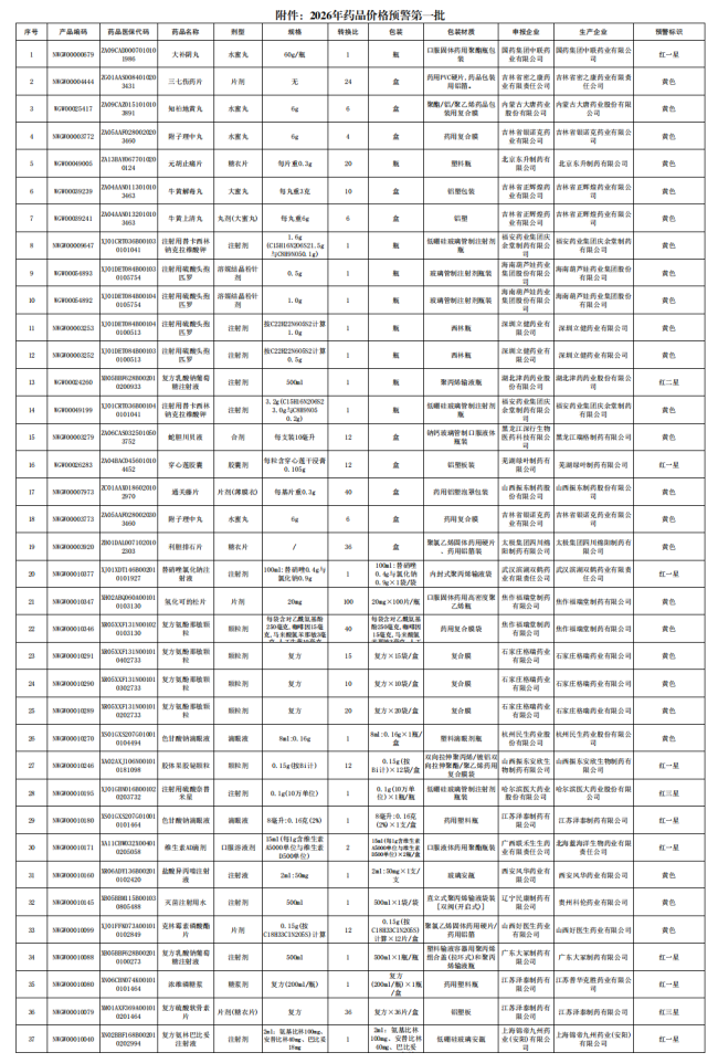 近日,江苏省医保局药品医用耗材阳光采购服务网发布2026年第一批药品预警情况,123个药品被纳入,其中中成药居多,如安宫牛黄丸(每丸重3g(天然牛黄))、大补阴丸(60g/瓶)等,其次是化药。