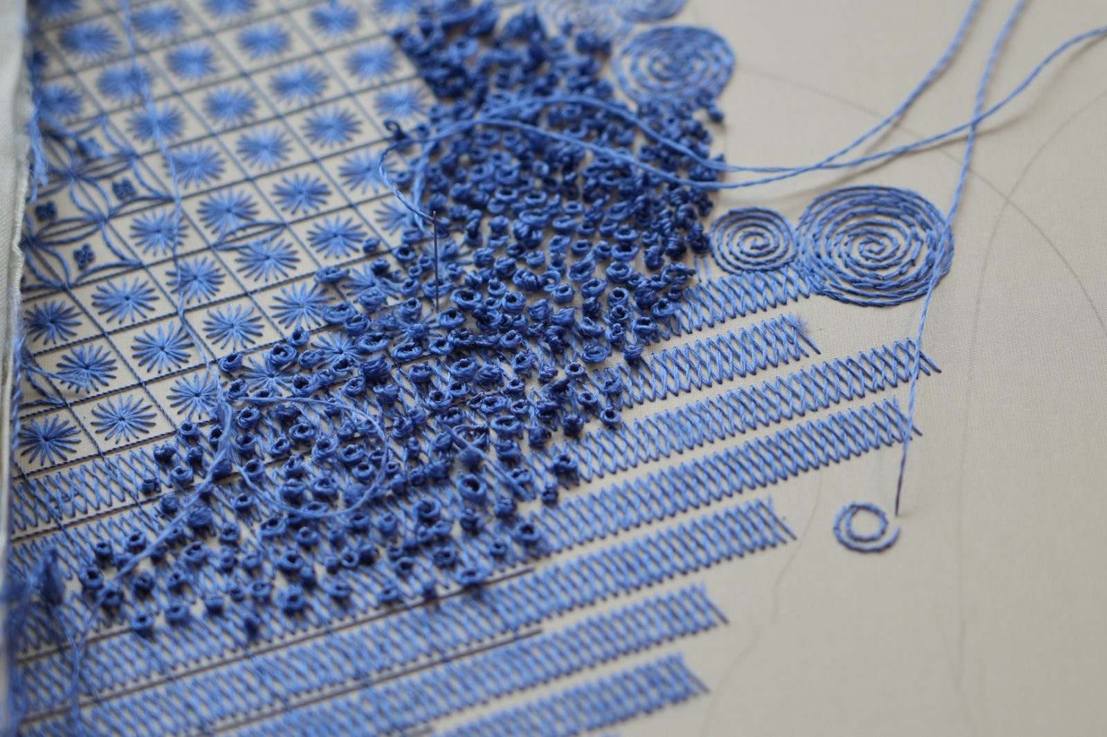 此外,展览同步推出两件全新创作。作品以单一色系丝线为媒介,通过针法的穿插、叠压与节奏变化构建出层层递进的肌理结构。画面不再依赖具象图案,而是将针法本身作为视觉核心,使刺绣从再现性的技艺转向对自身结构与表达边界的探索。这些方块不再是“图案的载体”,而是针法自身的纯粹表达——针脚成为笔触,丝线成为颜料,刺绣成为一门自律的艺术。