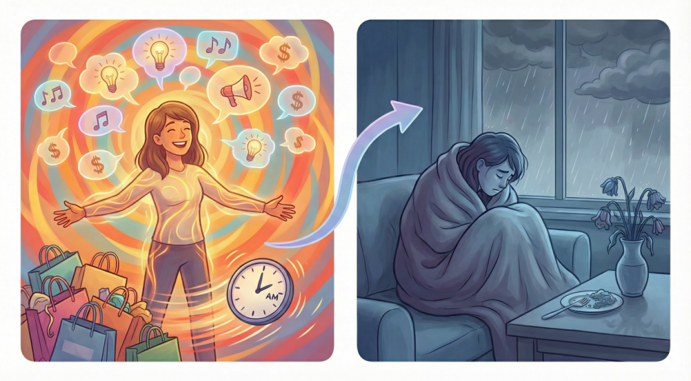 上个月突然像打了鸡血一样,每天只睡三四个小时,凌晨两点还在客厅拉着我聊他刚想到的创业。感觉好像突然就变得特别自信,甚至可以说是有点自负。更可怕的是瞒着我刷爆了信用卡,买了一堆昂贵的露营装备,说要辞职去环游世界。