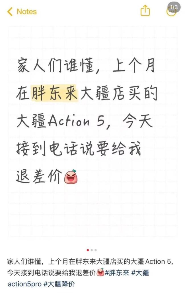 近日,多位网友在社交平台分享经历,称收到胖东来工作人员的电话通知,告知他们之前购买的大疆系列产品已降价,可前往门店专柜退还差价。此前,大疆品牌宣布多款产品降价,最高优惠达1478元