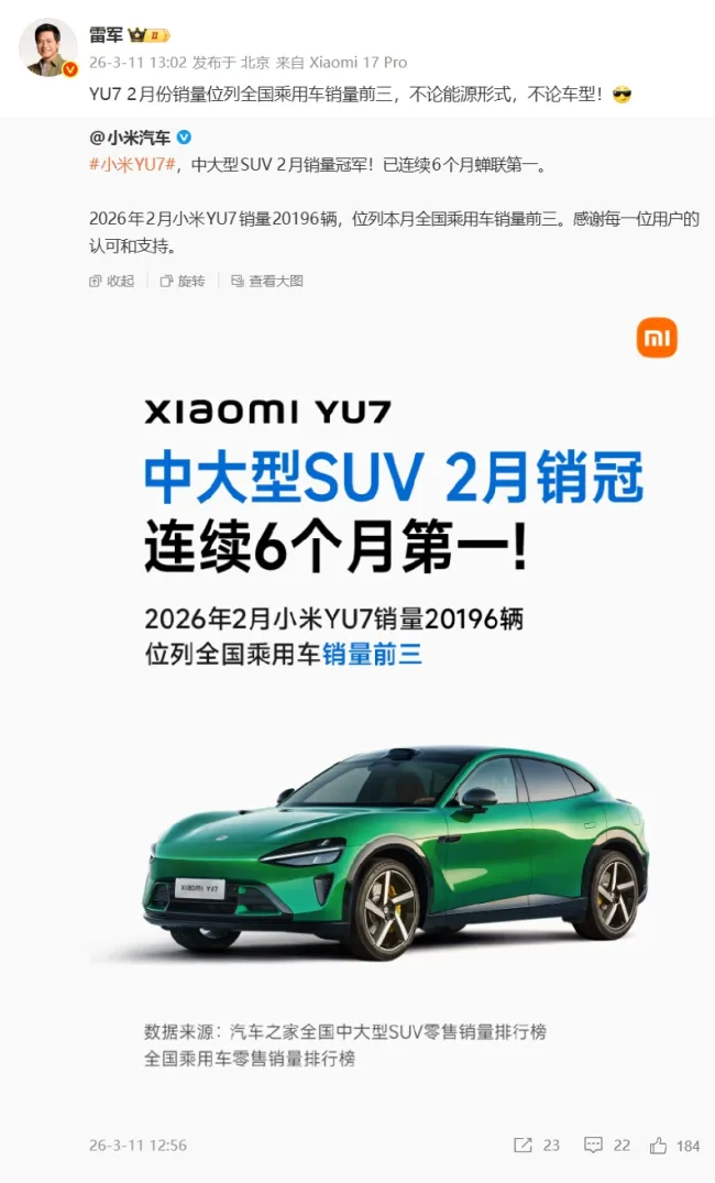 小米创办人、董事长兼CEO雷军在微博宣布,小米YU7汽车2月份销量位列全国乘用车销量前三,无论能源形式和车型。小米汽车官方微博也表示,小米YU7中大型SUV在2月销量夺冠,已连续6个月蝉联第一