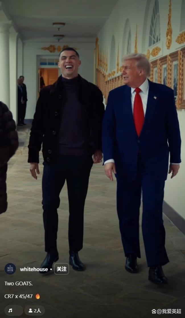 北京时间11月19日晚,白宫和C罗官方账号联合发布了一段视频,展示C罗与美国总统特朗普在走廊散步的情景。配文称:“Two GOATS(两个历史上的最佳)”。视频中两人谈笑风生,C罗不时咧嘴大笑并鼓掌,未婚妻乔治娜则在一旁微笑陪伴
