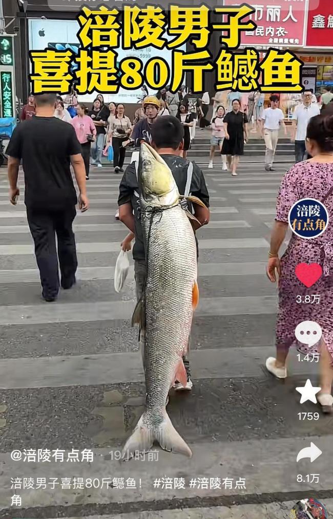 9月10日,重庆市涪陵区一名男子背着一条重达79斤的大鱼在闹市行走的视频引起了广泛关注。视频中,这名男子背着一米多长的鱼,在市区中穿行,路人纷纷露出惊讶的表情。网友们看到后纷纷表示,也想体验一下背这条大鱼的感觉
