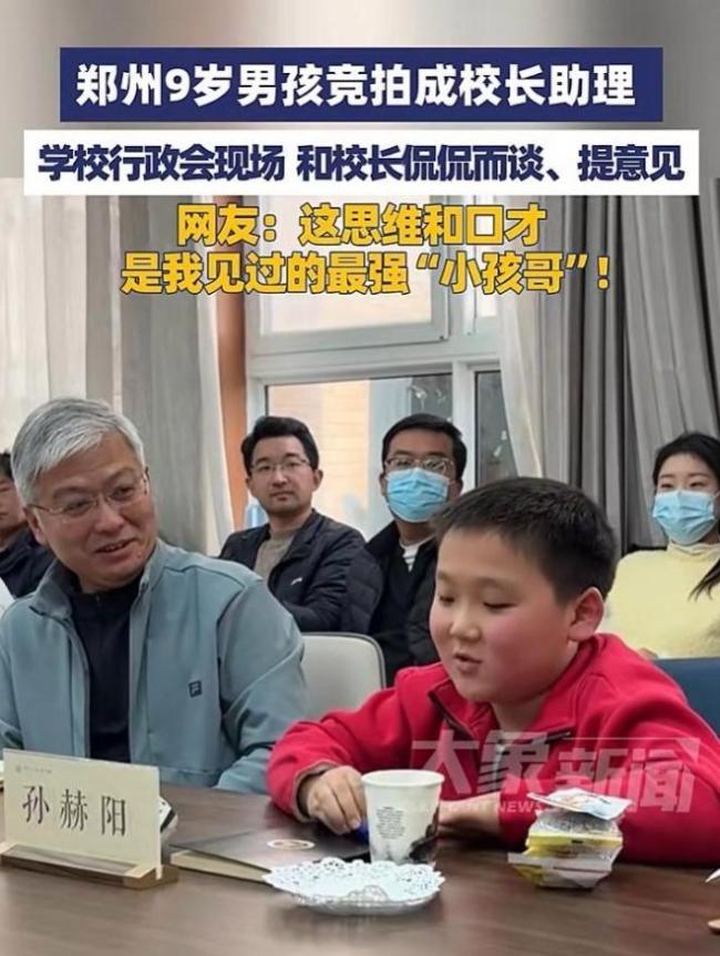 近日,河南郑州一名四年级小学生孙赫阳在校内竞拍中,以5块1的校园币成功竞拍成为校长助理,并获得了参加学校行政会的资格。在行政会上,他坐在校长旁边品茶、吃零食,与校长侃侃而谈,提出意见并分析问题,逻辑清晰且表现得非常放松