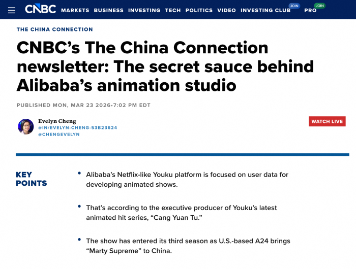 国际主流商业媒体CNBC近日发表了关于优酷年番《沧元图》开播及国漫出海的报道,该报道发布在CNBC官网及App,作为最新一期聚焦中国商业新闻的《The China Connection》newsletter主推内容。报道指出,自2023年《沧元图