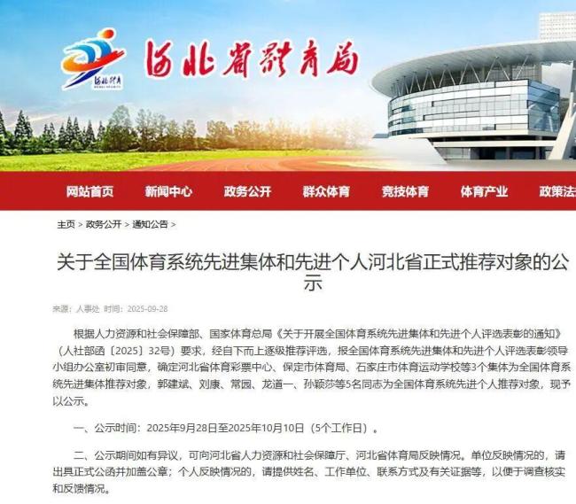 9月28日,河北省体育局官方网站公示了全国体育系统先进集体和先进个人的推荐对象名单。郭建斌、刘康、常园、龙道一、孙颖莎等五人被列为先进个人推荐对象。孙颖莎是一名出生于2000年11月的汉族女性,现为河北省体育局乒羽运动中心运动员
