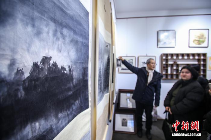 12月29日,宫春虎水墨画马艺术中心“喜迎马年,五代画马人马画艺术展”在天津古文化街海雅茶园启幕。展览展示了中国现代水墨画马先驱徐悲鸿先生及其弟子韦江凡、再传弟子宫春虎以及两代学生的马画作品。图为在津外籍
